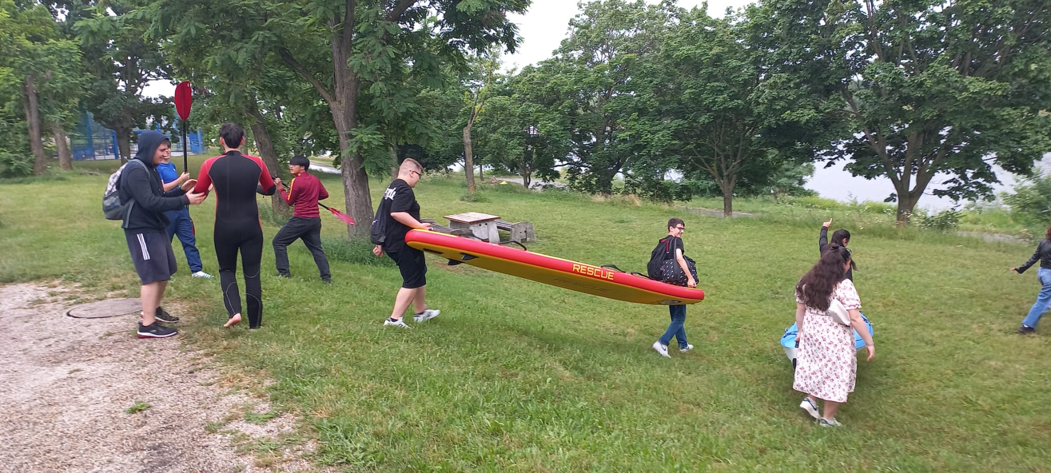 Nach diesem Teil konnten wir die Ausstattung der Wasserrettung besichtigen und wer wollte, diese auch ausprobieren. Obwohl das Wetter nicht sehr sommerlich war, hatten einige großen Spaß daran, das Stand-up-Paddeln und das Fahren mit dem Kanu zu versuchen. Das Wasser war relativ warm, sodass es auch kein Problem war, wenn der eine oder die andere auch hin und wieder im Wasser gelandet ist.